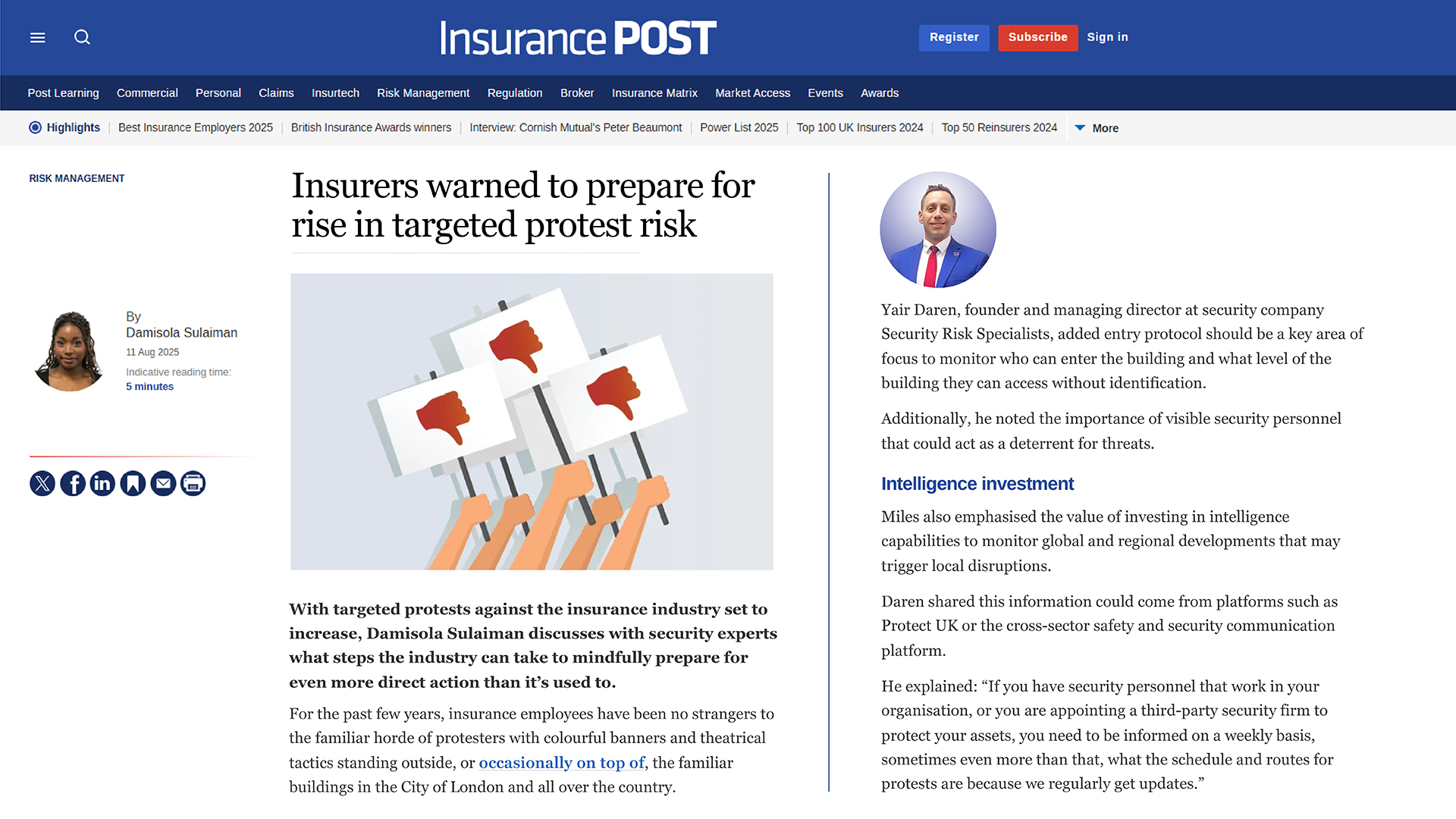 Our Director, Yair Daren, was featured in Insurance Post discussing the growing risk of targeted protests and the security measures organisations can take to stay protected.