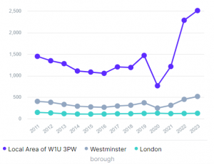 Figure 2 Annual crime rates for Manchester Square, Westminster and a breakdown of crimes committed within a one-mile radius in December 2023